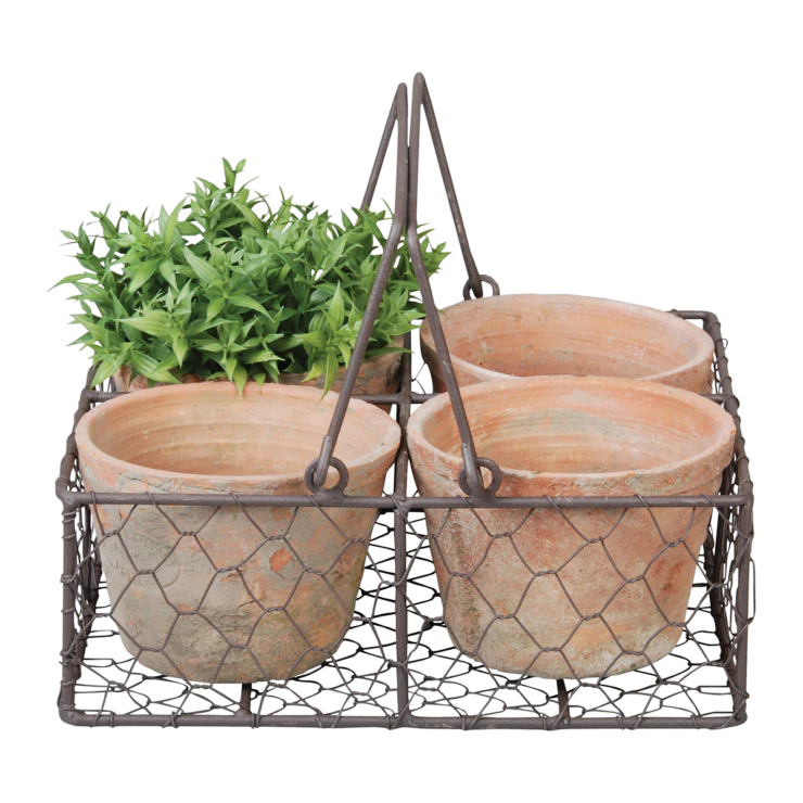 Aged Terracotta 4 potjes in draadmand met handvat