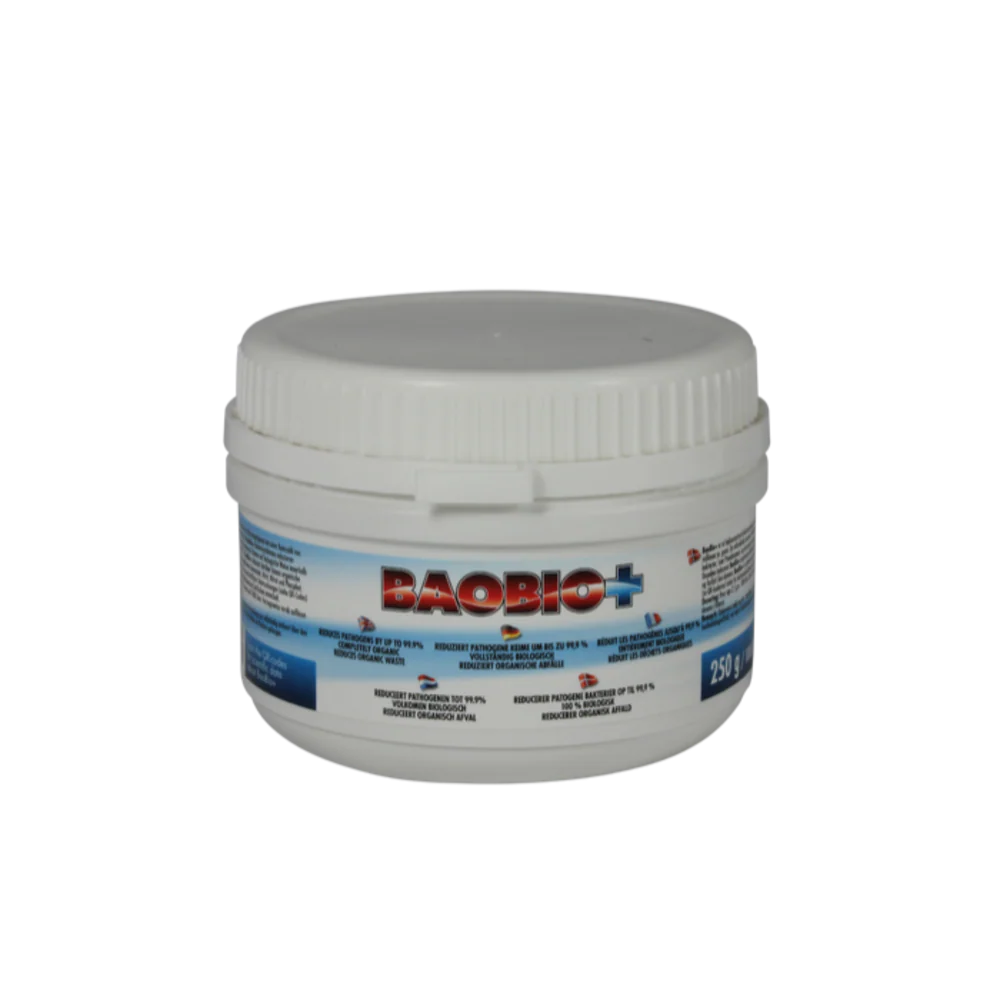 BaoBio+ is een zeer geconcentreerd bacteriepreparaat met een kiemgetal van meer dan 100 miljoen per gram. De BaoBio+ bacteriestammen reduceren op biologische wijze schadelijke Pseudonomas en Aeromonas stammen binnen 4 weken tot 99,9%.