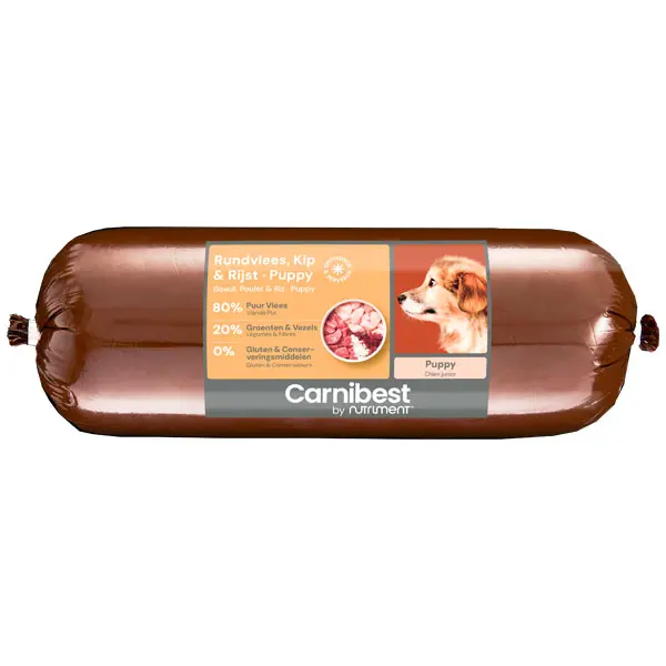 Bevat: Vers rundvlees, vers kippenvlees, fijngemalen groenten, rijst, koudgeperste plantaardige olie, natuurlijke vitaminen en mineralen.