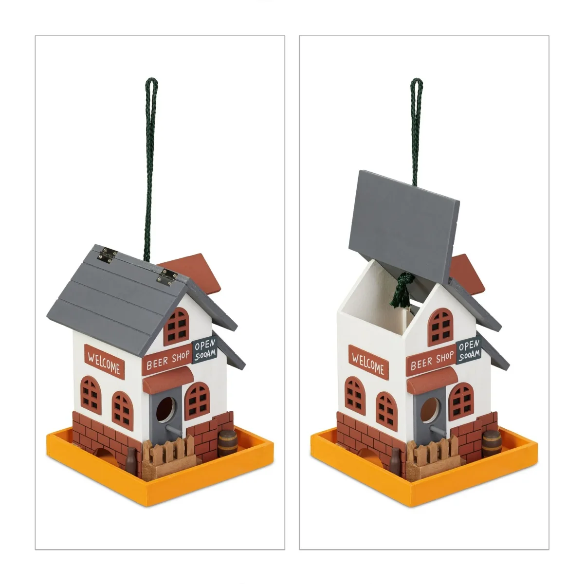 Met dit decoratie vogelhuisje haal je een echte eye catcher in huis. Het vogelhuis weet te overtuigen met zijn schitterende ontwerp in de vorm van een kroeg en is een blikvanger in de tuin, op het balkon of op het terras. Het decoratieve huisje met dak om open te klappen is gemaakt van populieren- en grenenhout en kan opgehangen of neergezet worden. Bovendien is hij heel geschikt om cadeau te geven aan liefhebbers van decoratie en vogels.