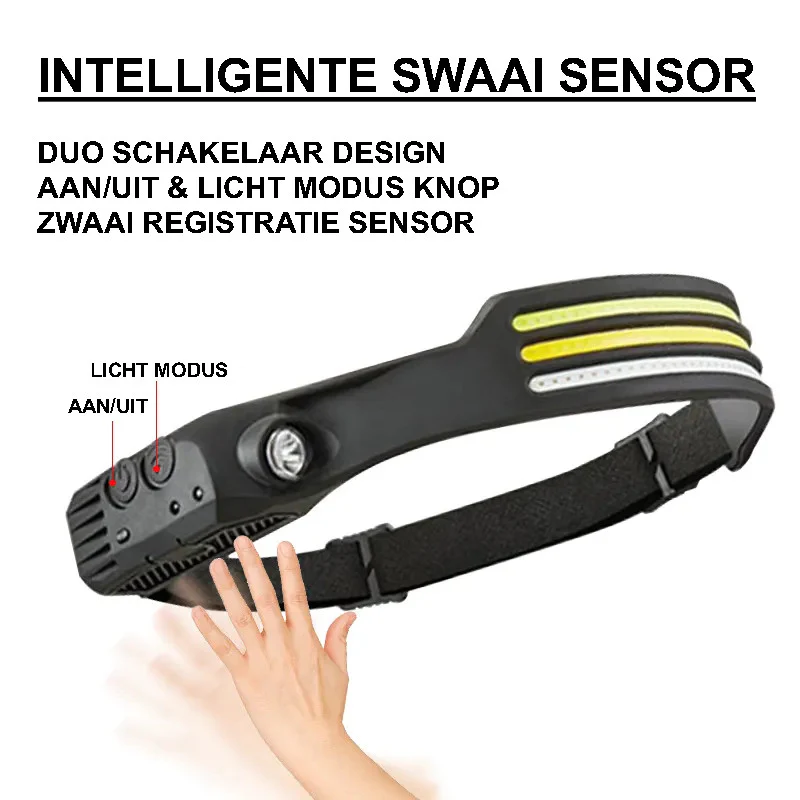 - Uitgerust met geavanceerde bewegingssensoren, maakt onze LED-hoofdlamp handsfree bediening mogelijk. Zelfs met handschoenen aan, zwaai eenvoudig met je hand binnen 10 cm van het apparaat om het snel in- of uit te schakelen in de bewegingsmodus.