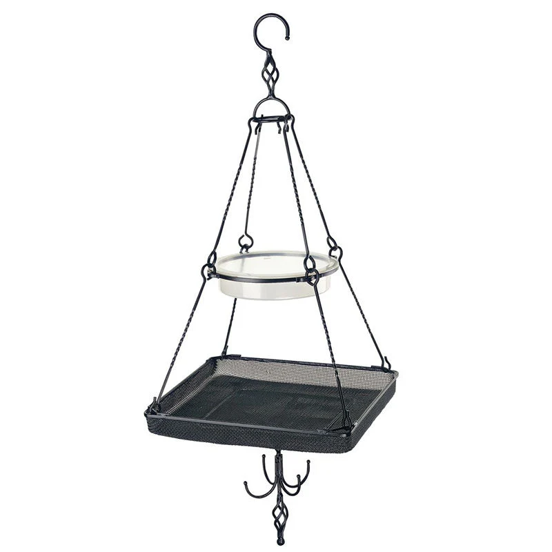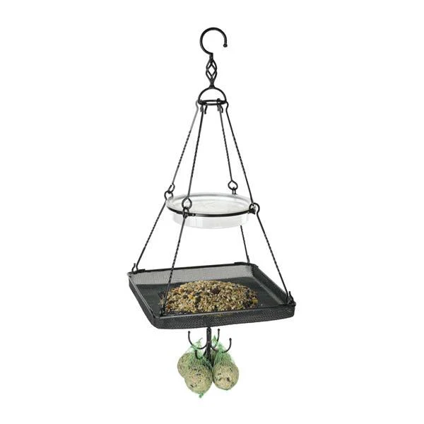 Gardman hangend vogel voederstaion. Een vogelbad gecombineerd met fijnmazige feedertray en decoratieve vetbolhanger. De Hanging feeding station bezit over stevige geribbelde hangers voor extra stabiliteit. De feedertray is fijnmazig, zo blijft er geen water in staan en blijft het voer een lange tijd goed. Hangend voederhuisje met decoratieve afwerking Verpakt in een geschenkdoos