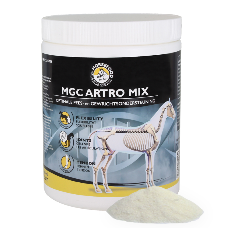 Horsefood MGC Artro Mix is een hoogwaardige combinatie van MSM (Methylsulfonylmethaan), glucosamine, chondroïtine en collageen. Ondanks het feit dat het lichaam enkele van deze stoffen zelf aanmaakt hebben paarden in een sterke groeifase, die zwaar moeten presteren, bij blessure of slijtage soms een extra aanvulling nodig. MSM (methylsulfonylmethaan) is essentieel voor de gezondheid en elasticiteit van bindweefsel en belangrijk voor de aanmaak van collageen. Collageen is nodig voor de structuur van bindweefsel en kraakbeen. Onmisbaar om stramheid te lijf te gaan.