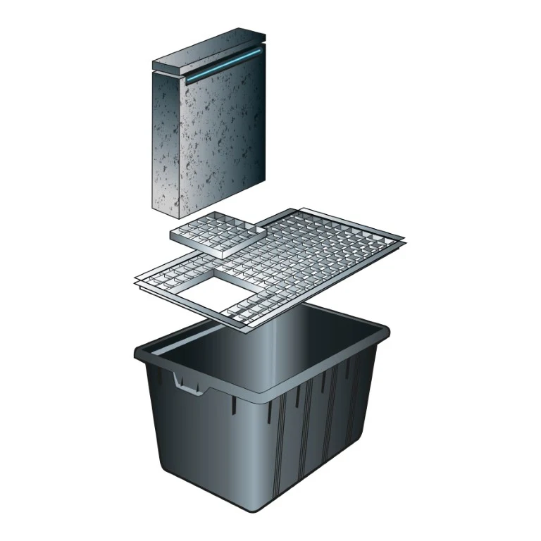Geschikt om te plaatsen over de Victoria Quadro 1 PE-Bassin. Op dit rooster kan een waterornament geplaatst worden, om hem zo makkelijk weg te werken in de grond.