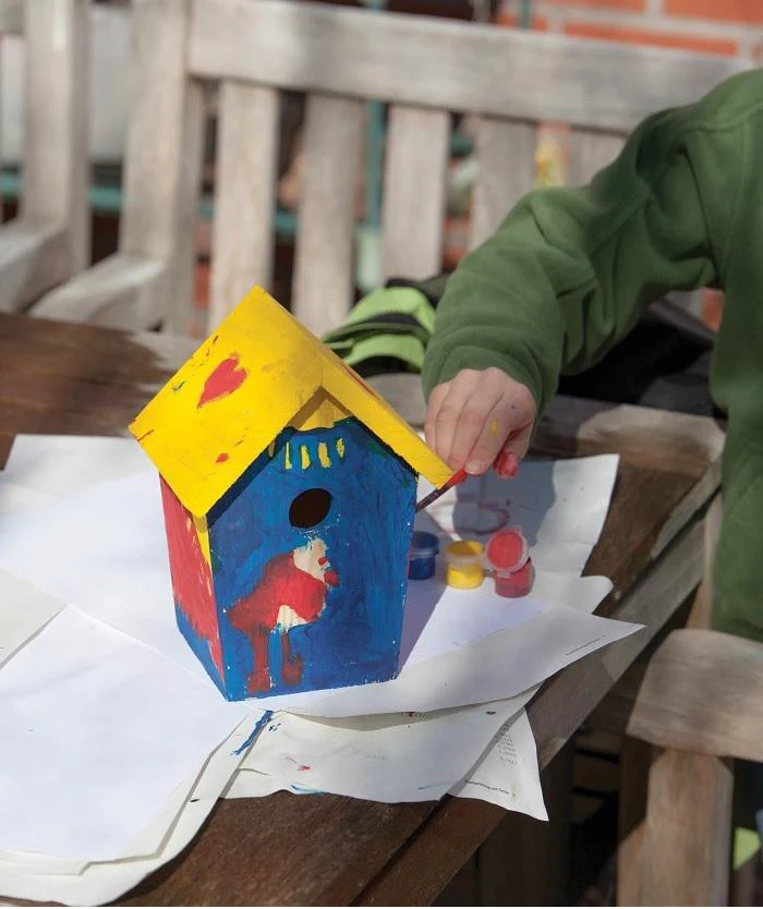 Dit Schilder je eigen vogelhuisje van het merk Best for Birds is zeer vermakelijk voor kinderen! Het vogelhuis is speciaal ontworpen voor kinderen om zelf te beschilderen. U betrekt uw kleinkind in de tuin en op een speelse wijze leren ze meer over de natuur. Het vogelhuisje is gemaakt is FSC-gecertificeerd vurenhout.Het vogelhuisje hoeft niet meer in elkaar gezet te worden in tegenstelling tot andere merken, het vogelhuisje is al gemonteerd. Het hout van het vogelhuis is onbehandeld en dat kan best zo blijven maar het is natuurlijk extra plezierig als uw kleinkind er een eigen, vrolijke sfeer aan kan geven door middel van de bijgevoegde kwast en drie te mengen kleuren milieuvriendelijke verf: rood, geel en blauw. Uw kleinkind zal er veel plezier aan beleven en trots zijn op zijn/haar eigen vogelhuisje!Door de vormgeving en het gemakkelijke invlieggat is dit vogelhuisje geschikt voor veel verschillende tuinvogels zoals bijvoorbeeld de koolmees, boomklever en de pimpelmees. Deze vogelhuisjes kunnen het hele jaar gebruikt worden, in het voorjaar zal het vogelhuisje als broedplaats dienen en in de herfst/winter als schuilplaats. Als er in de herfst toch geen vogels meer aanwezig zijn dan is het raadzaam het vogelhuisje schoon te maken. Om het de tuinvogels wat comfortabeler te maken gedurende de koudere en de erg warme perioden raden wij het u aan de vogels een waterplek en wat voer aan te bieden.Het vogelhuis is gemakkelijk te bevestigen aan een muur, schutting of boom. Wij raden u aan het vogelhuisje circa 1,8 meter van de grond en niet in de felle zon te bevestigen.Opgelet: dit vogelhuisje hoeft alleen beschilderd te worden! Het vogelhuisje hoeft niet meer in elkaar gezet te worden in tegenstelling tot andere merken, het vogelhuisje is al gemonteerd. Gebruikersvoordelen: Speciaal ontworpen voor kinderen FSC-gecertificeerd hout Bijgevoegde kwast en drie te mengen kleuren verf Eenvoudig te bevestigen Leuk idee voor kinderfeestjes, verjaardagen en schoolprojecten Technische gegevens: Merk Best for Birds Esschert design Afmetingen 15 cm. lengte x 12 cm. breedte x 20 cm. hoogte Materiaal FSC-gecertificeerd vurenhout Geschikt voor buiten ja Kleur vurenhout Verf inbegrepen? ja Kwast inbegrepen? ja Voorgemonteerd? ja