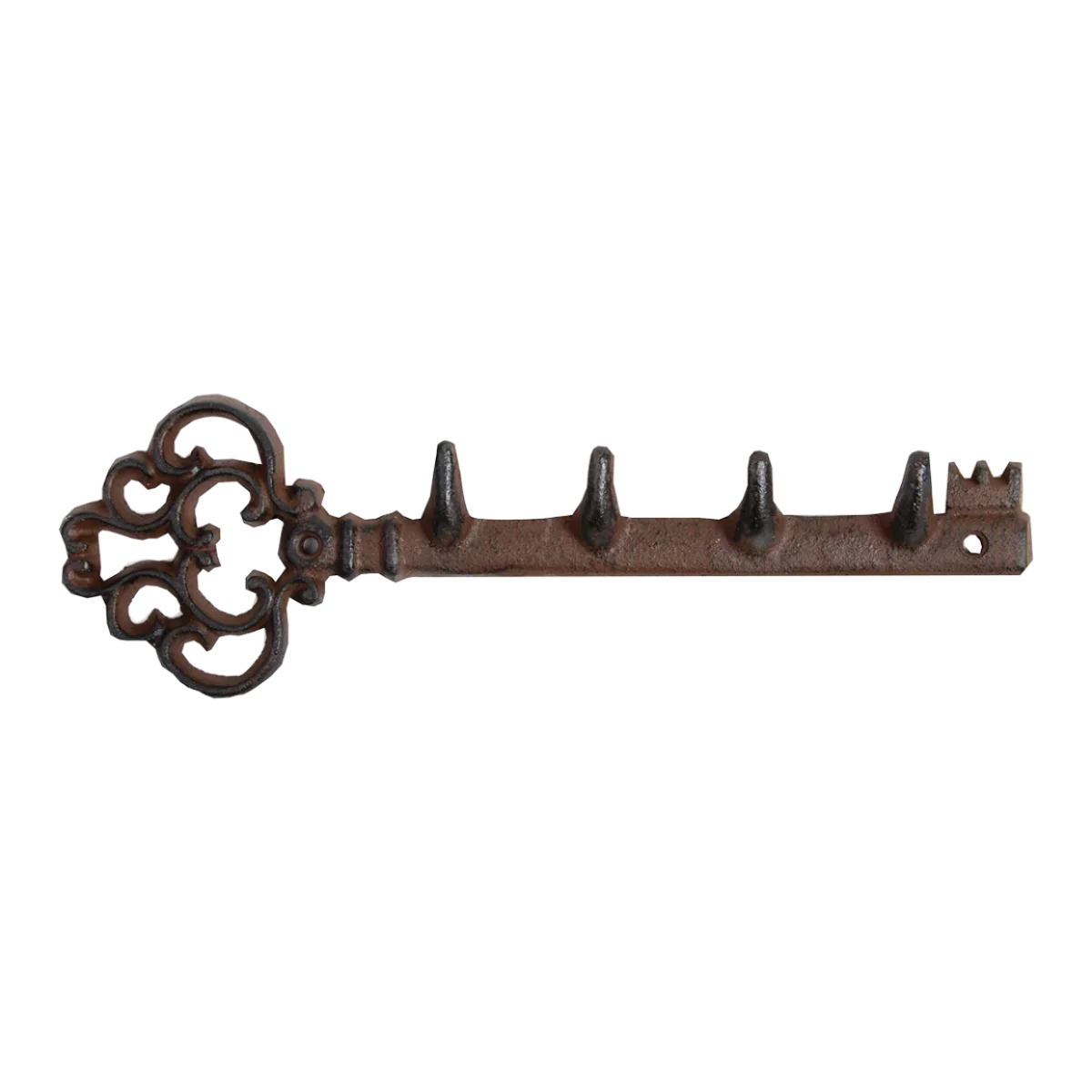 Deze rustieke gietijzeren hanger kan dankzij de twee ophanggaten eenvoudig gemonteerd worden. Aan de vier haken kunnen sleutels worden opgehangen maar uiteraard ook allerlei andere spullen.