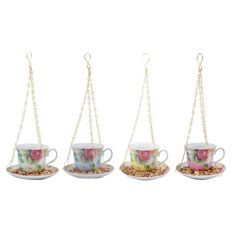 Tea Time voor vogels! Grootmoeders theeservies biedt vogels een voederplaats aan. Het theeservies geeft een nostalgische uitstraling aan deze voederhanger. Dit artikel is een combinatie van een voederkom en een drinkschaal. Dankzij de meegeleverde ketting kan deze kom overal opgehangen worden.