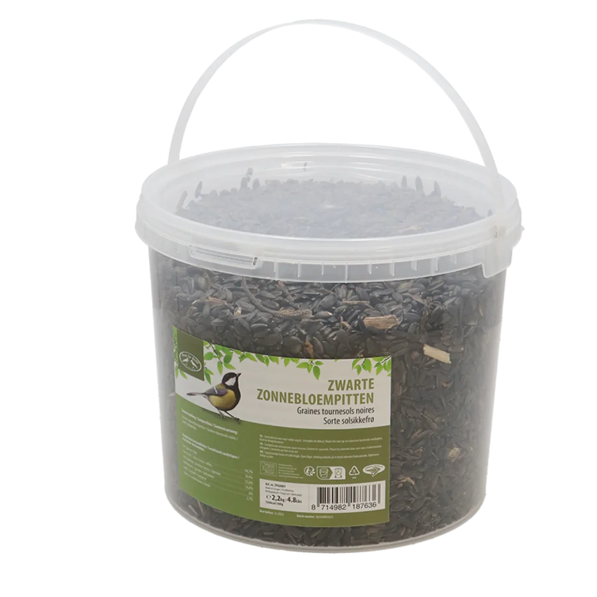 Met deze zwarte zonnebloempitten in een handige, hersluitbare emmer van 2,2 kg ondersteun je tuinvogels het hele jaar door. De zwarte pitten zijn extra olie- en energierijk, hebben een dunne schil en worden daardoor makkelijk gegeten door veel soorten. Ideaal voor voedersilo’s, voederhuisjes, voedertafels en grondvoederplekken.